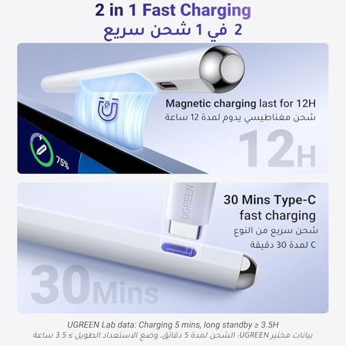 UGREEN 2 in1 Magnetic Charging Stylus Pen for Apple iPad Tilt Sensitivity Fast Type-C & Magnetic Charging Bluetooth Power Display Palm Rejection Stylus Pencil for iPad 2018-2022, Pro, Air, Mini