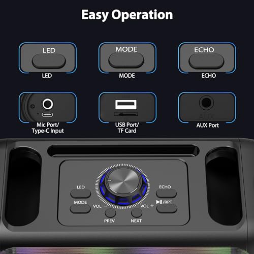 ♪ 【Versatile Karaoke Entertainment System】: This karaoke system connects with Bluetooth 5.0 for stable, long-range audio streaming, making it perfect for birthdays parties and home gatherings. It supports various media inputs, including Micro TF cards, USB drives, and AUX. The groove design on the karaoke machine allows you to place your phone. Its versatility makes it an excellent choice for home entertainment,and educational uses. ♪ 【Exceptional Sound Quality】: Experience exceptional audio with our Portable Bluetooth karaoke singing machine, featuring a 6.5-inch speaker and advanced bass technology for clear, sound and balanced volume. Ideal for all gatherings, ensuring high-quality, distortion-free music and vocal performances. Perfect for indoor and outdoor use, it transforms any event into a memorable concert experience, making it the ultimate entertainment choice for music lovers. ♪ 【Lightweight and easy to use】:Set up and start singing in minutes! A user-friendly interface make this portable bluetooth karaoke machine perfect for all ages. Its compact, portable size means you can easily take it anywhere. Powered by a high-capacity 3.7V/5200mAh rechargeable lithium-ion battery, it's energy-efficient, offering 6-8 hours of continuous music playback on a full charge and up to 10 hours of normal use. ♪ 【TWS Mode】:Experience immersive sound with our cutting-edge karaoke machine, featuring advanced TWS (True Wireless Stereo) technology. Connect two bluetooth singing speakers to create a powerful stereo system, enveloping you in rich, synchronized sound, promising an unparalleled music experience. Plus, with our commitment to satisfaction, enjoy a worry-free purchase with a one-year warranty and dedicated customer support for any inquiries or issues. ♪ 【Dynamic LED Lights】:The karaoke speaker, with its six vibrant color disco light modes, turns any space into an enthralling concert venue. Ideal for family gatherings or outdoor parties, the LED lights sync with the music's rhythm, crafting a captivating visual experience.The perfect gift for all ages, its portable design, easy-to-use features and brilliant LED lights make it suitable for both children and adults.